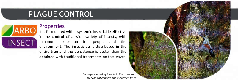 Ornamental trees Aphids and cochinillas: to obtain a quick and effective control, the treatment must be preventive (before the plague appears) In case the plague has already attacked the tree, the effectiveness of the treatment will depend on the absorption and the spreading of the product in the tree which was injected. Palm trees Picudo y Paysandissia: The generations may be produced along the whole year. The treatment should be performed as soon as the first signs of the activity of the insect appear. |