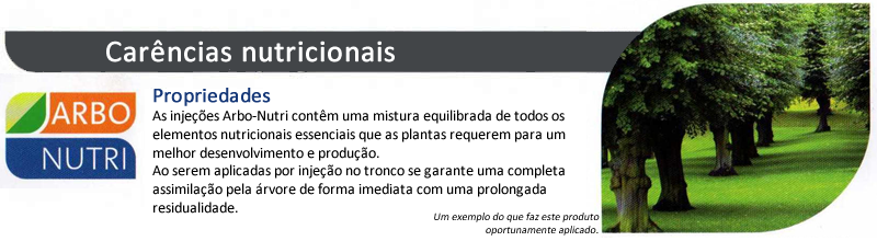 Tratamentos Estão especialmente indicadas para favorecer a resposta da árvore ante um enfraquecimento geral, que não possa ser relacionado com uma causa determinada, ou como complemento nos tratamentos de uma doença, uma praga ou algum outro tipo de estresse fisiológico (seca, geada, transplantes, etc.), em todo tipo de árvores ornamentais, especialmente naqueles que por seu porte, difícil acesso ou situação, for complicado realizar tratamentos convencionais. Também mostrou eficácia na sua utilização nos diferentes cultivos, respeitando as características próprias de cada um deles. Momento de Aplicação Ornamentais perenes Aplicar preferentemente antes do início da brotação de primavera ou durante o verão. Não aplicar durante o crescimento dos brotos e a expansão das folhas da brotação de primavera.