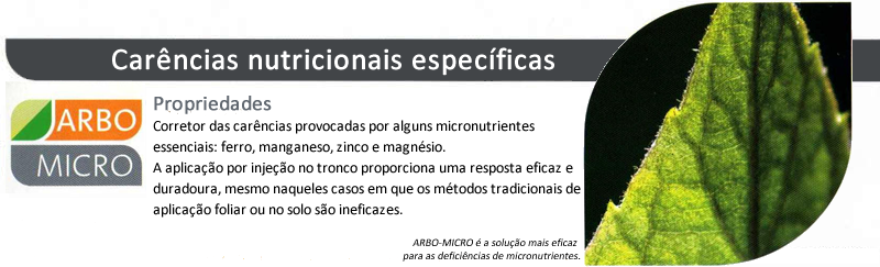 Tratamentos Cítricos e Ornamentais Perenes Aplicar ARBO-FERRO a cada dois ou três anos dependendo do grau de clorose que apresentarem as árvores. Recomenda-se injetar antes do início da brotação de primavera ou ao longo do verão. Não importa realizar aplicações no final do inverno, já que o produto se acumula na árvore e se remobiliza para as folhas a medida que esta recupera sua atividade durante a primavera. Oliveira A persistência do tratamento pode atingir os 4 anos. Nesta espécie pode ser injetado a qualquer tempo, exceto durante a floração. Pode ser mais conveniente realizar o tratamento a partir do final do inverno ou começo da primavera para que nas novas brotações se manifeste quanto antes o efeito do produto. Frutais e ornamentais de folha caducaMediante a aplicação a cada dois anos, as árvores podem manter-se verdes, neste caso as injeções de ARBO-FERRO podem ser aplicadas quando a árvore recupera a atividade no final do inverno, e antes de iniciado o crescimento de brotos e expansão das folhas jovens da brotação da primavera. Ou também quando a árvore estiver coberta completamente de folhas até o final do verão. |